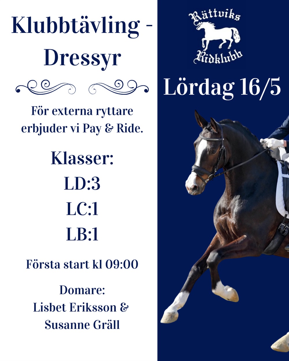 Vi bjuder in till en trevlig dressyrdag där både medlemmar och externa ekipage är varmt välkomna. Tävlingen arrangeras som en kombinerad klubbtävling och pay & ride.